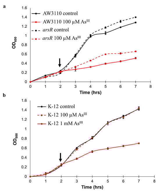 All E. coli cultures were grown in 200 mL of LB broth as batch cultures at 37 °C. LB broth was prepared in-house using tryptone (MilliporeSigma, Burlington, MA, USA), yeast extract (Thermo Scientific, Waltham, MA, USA) and sodium chloride (Fisher Scientific, Waltham, MA, USA) [45]. The K-12 MG1655 (wild type) and AW3110 (chloramphenicol cassette marked ΔarsRBC mutant) cell lines were a gift from Dr. Barry Rosen and are described in the original publication [11]. Cultures were inoculated with 2 mL of an overnight culture and tested under seven conditions (n = 3). To elicit a similar stress level in K-12 and AW3110 and based upon previous research [15], we chose to use 1 mM AsIII for K-12 and 100 µM AsIII for AW3110 and the arsR-complement. In addition, K-12 was also given 100 µM AsIII as a control for AsIII concentrations between K-12 and AW3110 strains. AsIII was administered 2 h post-inoculation, and growth was recorded via OD600 measurements every hour. Two hours after the addition of AsIII, 50 mL of each culture was removed. Cells were pelleted by centrifugation (4000× g, 10 min, 4 °C) and stored at −80 °C until further analyses. AW3110 and the arsR-complement were grown under chloramphenicol and kanamycin selection, respectively.