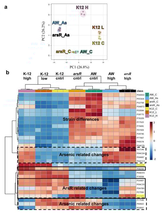 We speculated that protein expression would be altered due to AsIII stress and by the presence of ArsR. To investigate this, we employed shotgun proteomics to determine the relative abundance of proteins expressed by each strain under the different growth conditions. We identified 1840 proteins from the 4328 predicted protein-coding genes in K-12 MG1655 and 4243 predicted protein-coding genes in the AW3110 substrain (Supplementary Data Table S1) [16,17]. We choose to focus our analysis on metalloproteins since the arsRBC operon has been shown to differentially affect the global native metalloproteome under AsIII stress [15]. To do this, we filtered the identified proteins using the DAVID functional analysis (see methods) (Supplementary Data Table S2). From the identified protein pool, 619 (33.6%) were categorized as metalloproteins. Principal component analysis based on relative abundance revealed that AW3110 and arsR control samples grouped closely together and the AsIII treated samples grouped close together (Figure 2a). The K-12 control and K-12 low AsIII stress grouped close together, while the high AsIII stress samples were well separated from the other K-12 groups along both axes. Replicates in every treatment were tightly clustered with each other. A one-way ANOVA with a false discover rate cutoff of 0.001 revealed 363 metalloproteins significantly changed between all groups (Supplementary Figure S1). These data suggest that large changes in the metalloproteome occurred between sample groups that we interpret as deriving from AsIII stress and strain genotypes.