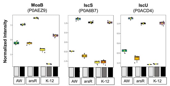 To better understand the differences in our proteomics data, we employed a hierarchical clustering analysis (HCA) on the top 30 dysregulated proteins. The results from our PCA were mirrored when the data were assessed in this fashion (Figure 2b). The HCA clustered K-12 samples apart from the AW3110 and arsR-complement samples. Within those clusters, high AsIII stress samples clustered with each other, and the low/no AsIII stress samples clustered together. Clustering based on changes in protein abundance highlighted strain differences, AsIII stress, and the presence of ArsR (Figure 2b). As expected, ArsR (Uniprot accession number P37309) was present in arsR-complement and arsenic-treated K-12 samples, while ArsC was present only in AsIII-treated K-12 samples. Within the strain difference protein cluster, several galactitol metabolism-related proteins were identified. In AW3110 and the arsR-complement, galactitol-1-phosphate dehydrogenase, GatD (P0A9S3), and tagatose-1,6-bisphosphate aldolase, GatY (P0C8J6) were more abundant than in K-12. High AsIII stress stimulated the expression of several metal-cofactor biosynthesis proteins. These were molybdenum cofactor biosynthesis protein B (MoaB, P0AEZ9), cysteine desulfurase (IscS, P0A6B7), and [Fe-S] cluster assembly scaffold protein (IscU, P0ACD4) (Figure 3). Six proteins seemed to be influenced by the presence of ArsR including proteins that were differentially expressed between AW3110 and the arsR high AsIII samples (Figure 2b). Several of these proteins were part of the TCA cycle. These proteins were acetyl-coenzyme A synthetase (P27550), isocitrate dehydrogenase (P08200), fumarase A (P0AC33) and fumarase B (P14407). These results suggest that E. coli responds to AsIII by increasing metallocofactor biosynthesis proteins and that TCA cycle proteins appear to be affected by the presence of ArsR.