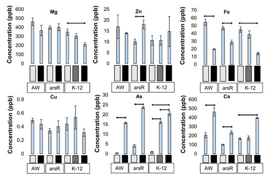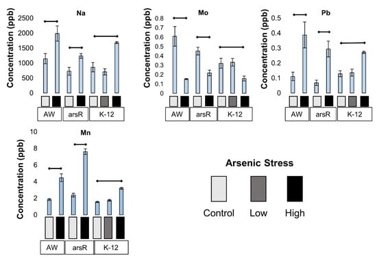 Based on the previous literature [18], we hypothesized that the intracellular metal concentrations would be different upon arsenic treatment, and that the presence of arsRBC operon and ArsR would impact observed changes, challenging us to quantify intracellular metal concentrations (cytosolic metal and protein-bound metal). To investigate this, we used ICP-MS, which allowed us to quantify many metals simultaneously. The metals detected by SEC-ICPMS are discussed below, along with noteworthy results. Additional metal concentrations can be found in Supplementary Data Table S3. As expected, arsenic concentrations inside the cells increased with AsIII stress levels (Figure 5). Interestingly, the arsR-complement strain had a higher concentration of arsenic than the K-12 and AW3110. The low AsIII stress K-12 samples and the high AsIII stress AW3110 samples resulted in the same intracellular arsenic concentrations and high AsIII stressed arsR-complement resulted in the highest concentration across sample groups. In all strains, high AsIII stress led to a significant increase (p < 0.05) in Ca, Na, Mo, Pb, and Mn, and a significant decrease in Fe, and Mo. Copper was unaffected by the presence of AsIII. Magnesium concentrations decreased under high AsIII stress only in K-12 with no change in AW3110 or the arsR-complement. Similarly, zinc only changed in the arsR-complement, where it increased with higher levels of AsIII. Additionally, copper, manganese, and calcium concentrations were significantly different (p < 0.05) between AW3110 and the arsR-complement controls. Sodium and iron concentrations were also different but to a lesser extent (p-value of 0.05, and 0.08, respectively). These results show that high AsIII stress impacts intracellular metal concentrations and that the presence of the arsR gene plays a role in metal homeostasis both in the presence and absence of AsIII.