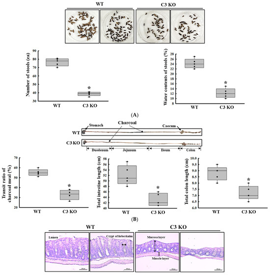 Stool excretion, GI transit ratio and mid colon histology of C3 KO mice. (A) Stools excretion. Digital camera images of the stools were taken immediately after collection from the metabolic cage. The total number and water contents of stools were measured as described in the Materials and Methods. Five to six mice per group were used for the stool sample collection, and each parameter was assayed in duplicates. (B) GI transit ratio and intestine length. The total intestinal tract was excised from mice of the subset groups treated with charcoal meal powder. The arrows indicate the position of the charcoal meal. Five to six mice per group were used in the GI transit ratio test, and the charcoal meal transit distance, total intestine length and colon length were measured in duplicates. (C) Histological structures of the mid colons. The H&E-stained sections of the mid colon from the WT and KO mice were observed at 100× magnification using a light microscope. Five to six mice per group were used in the histological analysis, and each parameter was measured in duplicates in two different slides. The data were presented as the mean ± SD. * p < 0.05 vs. WT mice. Abbreviation: WT, wild type; C3 KO, complement C3 knockout; GI, gastrointestinal; H&E, hematoxylin and eosin.