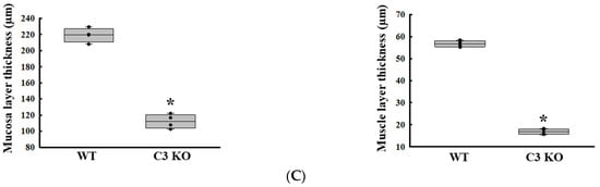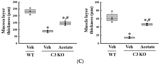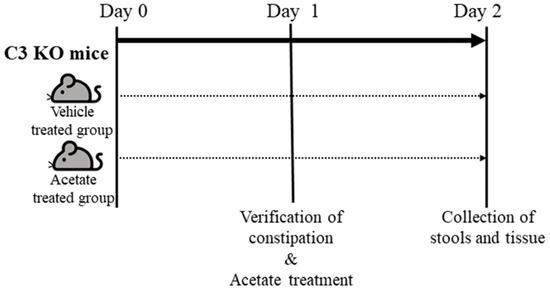 Acetate treatment was used to upregulate the expression of ALPI, as described in our previous studies (Figure 9) [14]. Sixteen-week-old WT (n = 7) and C3 KO mice (n = 14) were divided into groups as follows; Untreated WT mice (n = 7), vehicle-treated C3 KO mice (n = 7) and acetate-treated C3 KO mice (n = 7). The upregulation of ALPI expression was induced by the oral gavage of a single dose of acetate (50 mg/kg, Sigma-Aldrich Co., St. Louis, MO, USA) in 1× phosphate buffer saline (PBS) solution for a day, while the mice in the vehicle-treated group were injected with the same volume of 1× PBS solution. At 24 h after the final acetate treatment, all mice were individually held in metabolic cages (Daejong Instrument Industry Co., Ltd.) for two days to analyze the GI motility and excretion parameters and were euthanized using CO2 gas. Also, the colon tissue samples were collected and stored at −80 °C until mRNA and protein analyses could be carried out.