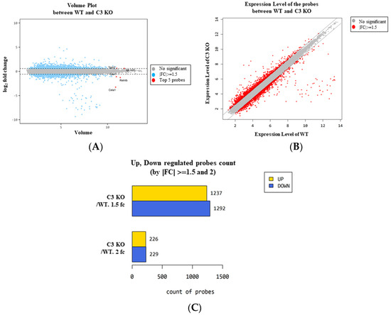 Volume and scatter plots of the normalized microarray in C3 KO mice. (A) Volume plot of the WT mice and C3 KO mice. (B) Scatter plot of the WT and C3 KO mice. (C) Differentially regulated probe count. The number of genes expressed differently between WT and C3 KO mice were represented as 1.5 FC and 2 FC. Abbreviation: WT, wild type; C3 KO, complement C3 knockout; FC, fold change.