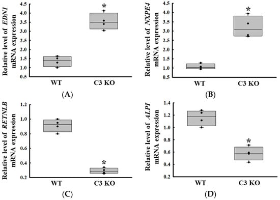 We confirmed the reliability of the gene expressions obtained from the microarray analysis. To achieve this, the expression level of two upregulated genes (endothelin-1; EDN1 and neurexophilin and PC-esterase domain family member 4; NXPE4) and two downregulated genes (RETNLB and ALPI) were measured by RT-qPCR analyses. The expression patterns of these genes were completely reflected in those observed from the microarray analysis of the mid colon in C3 deficiency-induced constipation, although the alteration rate varied. The expression level of the EDN1 and NXPE4 genes was increased in the C3 KO mice compared to the WT mice, while those of RETNLB and ALPI were decreased in the same group (Figure 3).
