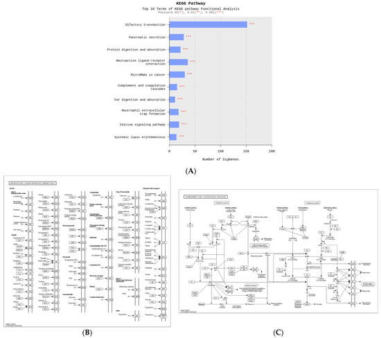 To identify the biological functions of the genes associated with C3 deficiency-induced constipation, a Kyoto Encyclopedia of Genes and Genomes (KEGG) pathways analysis was conducted on 1237 upregulated genes and 1292 downregulated genes. Among these 2529 genes, the largest number of genes (150 genes) were related to olfactory transduction. Also, these analyses showed that some of these genes were related to ten important pathways, including olfactory transduction, pancreatic secretion, protein digestion and absorption, neuroactive ligand–receptor interaction, microRNAs in cancer, complement and coagulation cascades, fat digestion and absorption, neutrophil extracellular trap formation, calcium signaling pathway and systemic lupus erythematosus (Figure 4A). Specifically, several DEGs such as vitronectin (VTN), C3, C4A, CD59b antigen (CD59b), integrin alpha X (ITGAX), fibrinogen alpha chain (FGA), coagulation factor III (F3), CD55 molecule, decay accelerating factor for complement (CD55), kininogen 1 (KNG1), complement C3d receptor 2 (CR2), C7, fibrinogen gamma chain (FGG) and peptidase inhibitor, clade A, member 1C (SERPINAL1C) belonged to the neuroactive ligand–receptor interaction pathway (Figure 4B). In addition, the complement and coagulation cascades pathway included several marker genes including 2210010C04Rik, Protease, serine 2 (PRSS2), amylase alpha 2B (AMY2B), PRSS1, trypsin (TRY)4, cholecystokinin A receptor (CCKAR), TRY5, TRY10, gamma-aminobutyric acid A receptor, subunit alpha 4 (GABRA4), glucagon-like peptide 1 receptor (GLP1R), 1810009J06Rik, C3, adrenergic receptor, alpha 1d (ADRALD), PRSS3, trace amine-associated receptor 7D (TAAR7D) and 9230113P08Rik for GI-related diseases (Figure 4C). Therefore, these results suggest that the DEGs associated with C3 deficiency-induced constipation are closely associated with olfactory transduction, neuroactive ligand–receptor interaction, microRNAs in cancer, pancreatic secretion, protein digestion and absorption, and the calcium signaling pathway.