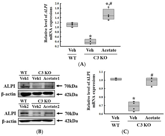Transcription and expression levels of the ALPI gene and proteins. (A) Transcription level of the ALPI gene in acetate-treated C3 KO mice. The transcription levels of the ALPI gene were measured in the total mRNA of the epithelial cells by RT-qPCR using specific primers. The mRNA levels of each gene were calculated based on the intensity of β-actin as an endogenous control. The preparation of total RNAs was performed on three to five mice per group, RT-qPCR analyses were assayed twice for each total RNA. (B) Expression levels of ALPI proteins in acetate-treated C3 KO mice. After collecting the mid colons from the C3 KO mice, the expression levels of ALPI proteins were assessed in tissue homogenates using the specific primary antibody and densitometry. The tissue homogenates were prepared from four to six mice per group and the Western blot was analyzed twice for each sample. After normalizing with β-actin as endogenous control, the relative level of ALPI expression was presented as a relative value to the vehicle-treated WT group (C). The data were presented as the mean ± SD. * p < 0.05 vs. no treated group. # p < 0.05 vs. vehicle-treated C3 KO group. Abbreviation: WT, wild type; C3 KO, complement C3 knockout; ALPI, alkaline phosphatase intestinal; RT-qPCR, quantitative real-time PCR.