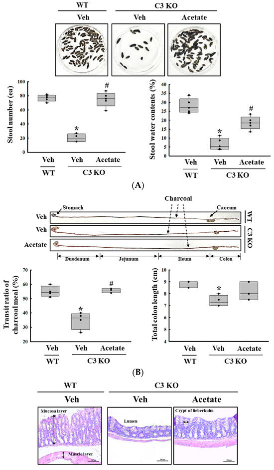 Firstly, the animal protocols used in this study were reviewed in terms of science, ethics and safety, and approved by the Pusan National University-Institutional Animal Care and Use Committee (PNU-IACUC; Approval Number PNU-2023-0407). All mice were provided from Laboratory Animals Banks in the Korea Food and Drug Administration (KFDA). They were provided ad libitum access to tap water and a standard irradiated chow diet (Samtako BioKorea Co., Osan, Republic of Korea). Also, these mice were bred at the PNU-Laboratory Animal Resources Center (LARC), which is accredited by the KFDA (Accredited Unit Number: 000231) and the Association for Assessment and Accreditation of Laboratory Animal Care (AAALAC, Accredited Unit Number: 001525). The LARC provided an international standard environmental condition for animal breeding including 23 ± 2 °C temperature, 50 ± 10% relative humidity, 12 h of light/dark cycle (lights on at 08:00 h and off at 20:00 h) and a specific pathogen free (SPF) state. The WT and C3 KO mice were used for microarray analyses, acetate treatment, and constipation phenotypes analyses.