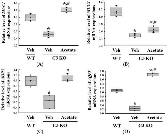 Transcription level of (A) MUC1, (B) MUC2, (C) AQP3 and (D) AQP8 gene in the colon tissue of acetate-treated C3 KO mice. The transcription levels of four genes were measured in the total mRNA of the colon tissues by RT-qPCR using specific primers. The mRNA levels of each gene were calculated based on the intensity of β-actin as an endogenous control. The preparation of total RNAs was performed on three to five mice per group, RT-qPCR analyses were assayed twice for each total RNA. The data were presented as the mean ± SD. * p < 0.05 vs. no treated group. # p < 0.05 vs. vehicle-treated group. Abbreviation: WT, wild type; C3 KO, complement C3 knockout; MUC, mucin; AQP, aquaporin.