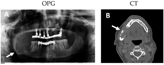 Pre-surgical orthopantomography (OPG), computed axial tomography (CT). An expansive and osteolytic lesion in the right mandibular angle lesion with a basilar remnant of about 1 cm in diameter is observed in the OPT image ((A), arrow). The CT indicates that the lesion affects both mandibular cortices ranging from the right mandibular angle to tooth 45 ((B), arrow).