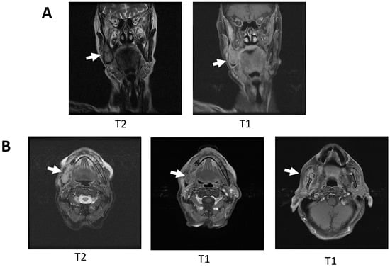 Due to the clinical-radiological aspect, suspicious of malignancy, it was decided to perform an MRI and to take an incisional biopsy. The histological result showed a benign lesion with epithelial hyperplasia, hyperkeratosis, and parakeratosis with areas of fibrosis without being able to offer a clear diagnosis, a result that is repeated in multiple subsequent biopsies despite the aggressive behavior of the lesion. MRI revealed a tumor mass with mandibular infiltration and probable involvement of the masticatory space and deep parotid lobe, destroying the vestibular and lingual cortex and ipsilateral adenopathies at levels IB and IIA (Figure 2A,B). In the absence of a histological diagnosis of malignancy, it was decided to take cytological samples by fine-needle aspiration puncture (FNA) of the lymph nodes and take new serial biopsies in the operating room without detecting cells suspicious of malignancy in any of the samples.