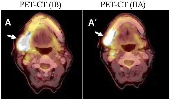 Pre-surgical PET-CT showing the uptake in the right mandibular angle of SUVmax 17.5 with adenopathy at levels IB (A) and IIA (A′) with uptake of up to SUVmax 4.3 (arrows).