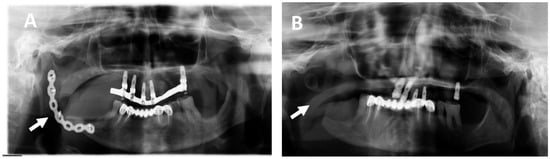 Post-surgical orthopantomographies (OPG) image showing the reconstruction plate of 2.0 mm thickness before (15 January 2019) (A) and after removal of the plate (23 March 2021) (B).