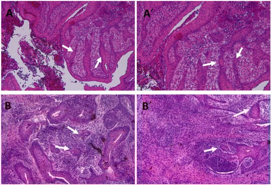 Hematoxilin eosin staining of the biopsy obtained from the lesion located in the right upper jaw. The lesion corresponded to an odontogenic squamous tumor characterized by the formation of variably sized nests and cords of uniform, benign-appearing, squamous epithelium with occasional vacuolization and keratinization (arrows) ((A): 10× and (A′) 20×). Histopathological analysis of the biopsy obtained from the recurrent lesion corresponding to the mucosa infiltrated by squamous cell carcinoma. The mucosa shows infiltration of the stroma by nests of moderately squamous differentiation cells with little nuclear and cellular atypia, with cytoplasmic keratinization that focally shows cystic areas (arrows). No vascular or perineural invasion is identified ((B): 10× and (B′): 20×).