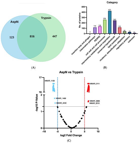 Distribution of the total proteins of the M. marinum proteome. (A) Venn diagram showing the identified proteins using AspN and trypsin treatment. (B) Category of total proteins according to the Mycobrowser (https://mycobrowser.epfl.ch). (C) Volcano plot of PE/PPE proteins identified by AspN cleavage and trypsin cleavage. The value of the y-axis demonstrates the —log10 p-value of the comparison of the performance between AspN and trypsin. The value of the x-axis showed the log2 fold change between the trypsin and AspN identifications. The PE/PPE proteins that were significantly detected (p-value < 0.05) in the AspN and trypsin digested samples are indicated by red and blue dots over the grey line, respectively.