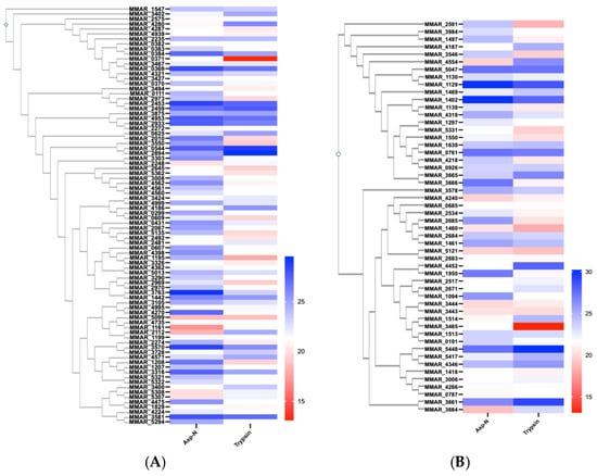 We used label-free quantification to evaluate the expression and secretion of PE/PPE proteins in the M. marinum proteome. Protein abundance was calculated by summing all unique peptides of each protein from each treatment and their differences were visualized using heatmaps (Figure 2). In general, the abundance pattern is in line with previous transcriptomic studies [,]. This was indicated by the high abundant MMAR_2894 and MMAR_5448 and the low abundant MMAR_0371 and MMAR_1161. We also found that 13 PEs and 14 PPEs shared similar abundance (with fold change < 1) in both protease treatment, in particularly, for proteins encoded by neighboring genes, such as PE_PGRS20 and PE_PGRS2 (MMAR_2969 and 2970) (Figure 2A), and PPE61 and PPE61_1 (MMAR_3444 and 3443) (Figure 2B). The association of gene neighborhood and protein abundance was also shown within one profile, for example with PPE31 and PPE32 (MMAR_2683 and MMAR_2684) in trypsin-treated samples and with PE_PGRS genes (MMAR_4560 and 4561) in AspN-treated samples. Variations of the abundance between the two profiles are consistent with the protease performance toward different PE/PPE as indicated in the volcano plot analysis (Figure 1C).