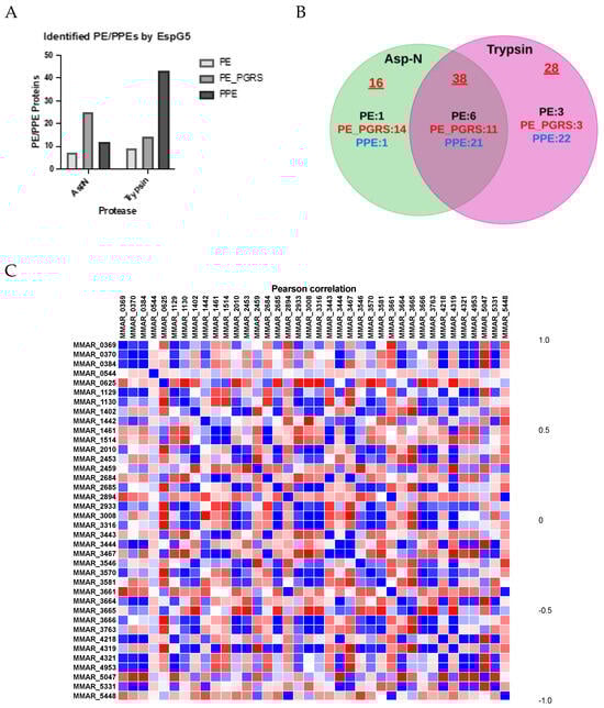Isolation of PE/PPE proteins from M. marinum culture filtrate by EspG5 pulldown. (A) Identification of EspG5—interacting PE/PPE proteins by AspN— and trypsin—digested profiles is plotted. (B) Venn diagram demonstrates that 38 EspG5—interacting PE/PPE proteins can be found from AspN— [] or trypsin (purple) —treated samples. The numbers of PE/PPE proteins that were uniquely found in AspN and trypsin digests are indicated. (C) Pearson correlation of PE—PPE protein interactions. The correlation of the interaction is presented by the color spectrometry from red (low) to blue (high).
