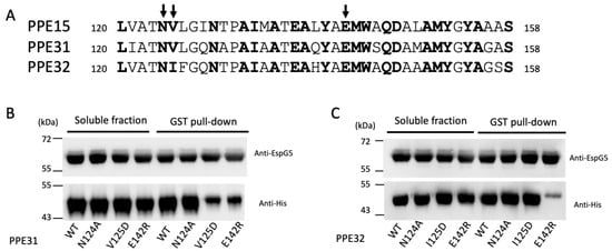 Next, we validated the binding of EspG5 with PPE31 and PPE32. These two PPE proteins have been proposed to be ESX-5 associated; however, their biophysical interactions with EspG5 have never been reported [,]. We purified His-tagged PPE31 and PPE32, and EspG5 with or without GST tag for nickel and GST pulldown assays. As shown in Figure 4, EspG5 interacted directly with PPE31 and PPE32. We questioned that their binding mode may share some similarities with the structurally solved EspG5-PPE15 pair []. From the multiple sequence alignment (Figure 5A), equivalently conserved residues Asn124, Val125/Ile125, and Glu142 on the EspG5-binding interface were selected for mutagenesis study. The solubility of these His-tagged PPE mutants, however, was very low when expressed individually in E. coli. Instead, their solubility was improved upon coexpression with GST-EspG5. GST pulldown assays were carried out using the coexpressed clear lysate. The results indicated that mutations V125D and E142R in PPE31 reduced the interaction with EspG5 (Figure 5B,C). Interestingly, for PPE32, only the E142R mutant exhibited an inhibitory effect towards EspG5 binding, suggesting that the conserved binding mode of EspG5 and PPE lies on residue Glu 142.