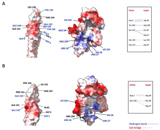 Homology models of EspG5 in complex with PPE31 (A) and PPE32 (B). (Left) The ‘open book’ views of the structural interface. The PPE proteins and EspG5 molecular surfaces are colored by electrostatic potential. The residues on the binding interface are labelled. (Right) Residues forming hydrogen bonds (––) and salt bridges (---) on the interface are indicated.