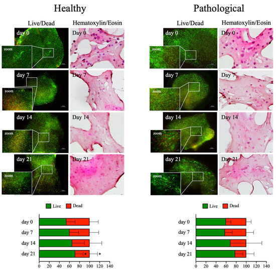 Live and dead assays and Hematoxylin and Eosin staining of healthy and pathological hTSPCs. Cells were cultured within the 3D fibrin scaffold in a medium supplemented with hTGF-β1 under perfusion for up to 21 days. Viable cells appear in green and non-viable cells in red. The fluorescence signal was quantified at different time points (0, 7, 14, 21 days) using ImageJ software (rel.1.52p). Scale bar: 500 μm, 200 μm for magnification (L&D); 50 μm (H&E). Data are shown as mean ± SD; * p ≤ 0.05 vs. day 14; n = 4 (biological replicates).