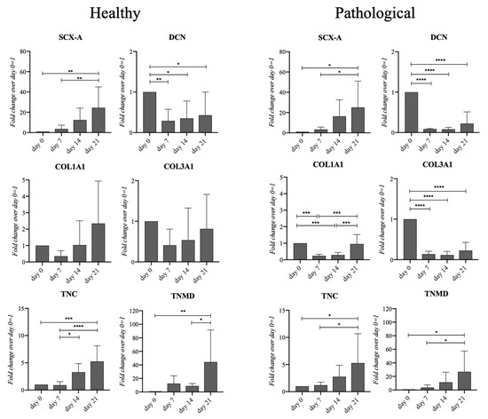 Gene expression profiles for tenogenic markers of healthy and pathological hTSPCs. Both cell populations were cultured within the 3D fibrin scaffold in a medium supplemented with hTGF-β1 under perfusion for up to 21 days. Different tenogenic markers (SCX-A, DCN, COL1A1, COL3A1, and TNC) were monitored by RT-qPCR at fixed time points (0, 7, 14, 21 days). Relative quantification for each mRNA gene expression normalized to endogenous GAPDH (internal control) was calculated using the 2−ΔΔCt method and presented as fold change over day 0 (hTSPCs just after inclusion in the fibrin scaffold) = 1. * p < 0.05; ** p < 0.01; *** p < 0.005; **** p < 0.001 vs. day 0; n = 4 (biological replicates).