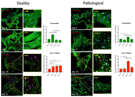 Immunofluorescence analysis of Tenomodulin and type I collagen proteins in healthy and pathological hTSPCs. Both cell populations were cultured within the 3D fibrin scaffold in a medium supplemented with hTGF-β1 under perfusion for up to 21 days. Signal intensity at each time point (0, 7, 14, 21 days) underwent semiquantitative analysis using ImageJ software (rel.1.52p) and normalized by the cell number (e.g., by the number of cell nuclei revealed by DAPI staining). Scale bar: 250 μm (magnification: 25 μm). Data are shown as mean ± SD. * p < 0.05; ** p < 0.01; *** p < 0.005; **** p < 0.001 vs. day 0; n = 4 (biological replicates).