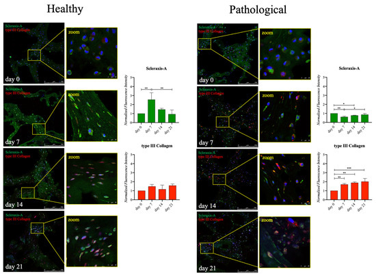Immunofluorescence analysis of Scleraxis-A and type III collagen proteins in healthy and pathological hTSPCs. Both cell populations were cultured within the 3D fibrin scaffold in a medium supplemented with hTGF-β1 under perfusion for up to 21 days. Signal intensity at each time point (0, 7, 14, 21 days) underwent semiquantitative analysis using ImageJ software (rel.1.52p) and normalized by cell number (e.g., by the number of cell nuclei revealed by DAPI staining). Scale bar: 250 μm (magnification: 25 μm). Data are shown as mean ± SD. * p < 0.05; ** p < 0.01; *** p < 0.005 vs. day 0; n = 4 (biological replicates).