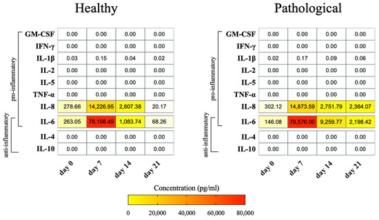 Pro-inflammatory and anti-inflammatory cytokine measurement in the culture medium of healthy and pathological hTSPCs. Cytokine levels were detected in cellular supernatants throughout the 3D culture under perfusion on days 0, 7, 14, and 21 using an immunobead-based multiplex assay. Data are reported as a heatmap from white (lowest value, 0 pg/mL of concentration) to red (highest value). The heatmap was made using Prism software (v. 9.0, GraphPad Software, LLC, San Diego, CA, USA).