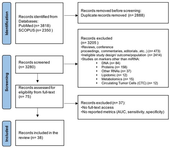 The flowchart in Figure 1 represents the search and selection strategy for this study. The initial search resulted in a total of 6168 studies, consisting of PubMed (n = 3818) and SCOPUS (n = 2350) articles. After the removal of duplicates (n = 2888) and applying exclusion criteria, 3205 studies were excluded, resulting in 75 articles selected for further evaluation. Additionally, 37 articles were excluded due to absence of reported metrics (AUC, sensitivity, specificity) or lack of full-text access, leaving 38 studies for inclusion in this systematic review.
