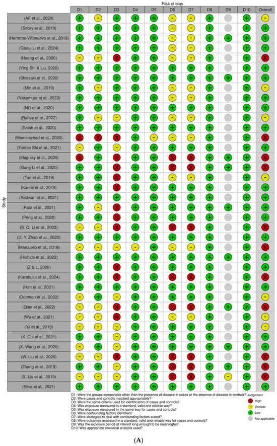 The quality of the included studies was evaluated by two independent reviewers (A.Z. and A.S.) using the Joanna Briggs Institute (JBI) tools for case-control studies. Specific checklist items used from the JBI tools are detailed in []. Discrepancies were resolved through consensus.