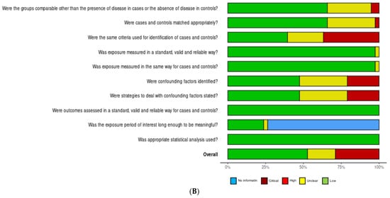JBI assessment of studies [,,,,,,,,,,,,,,,,,,,,,,,,,,,,,,,,,,,,,,] using ROBvis software (https://www.riskofbias.info/welcome/robvis-visualization-tool, accessed on 19 August 2024). (A) graph and (B) summary.