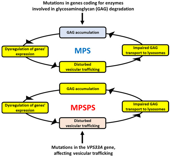 The hypothesis of the mechanisms of GAG accumulation in MPSPS. In classical MPS types (upper panel), GAG(s) accumulate(s) due to mutation(s) in one of genes coding for enzymes involved in degradation of this/these compound(s). GAG storage causes various secondary effects, among others, dysregulation of expression of many genes, resulting in pathological changes in different cellular processes. Disturbed vesicular trafficking is among them, leading to impaired transportation of GAGs into lysosomes. This makes GAG accumulation even more pronounced (as GAGs cannot be effectively degraded outside of lysosomes), which drives a spiral of above-described reactions within a positive feedback loop, enhancing the pathological processes. In MPSPS (lower panel), a similar spiral of reactions resulting in GAG accumulation occurs. However, it is initiated by impaired vesicular transport of GAGs (due to deficiency in VPS33A activity, which is required in this process) rather than dysfunction of an enzyme involved in GAG degradation. Nevertheless, the final effect (GAG accumulation) is similar in both classical MPS and MPSPS.