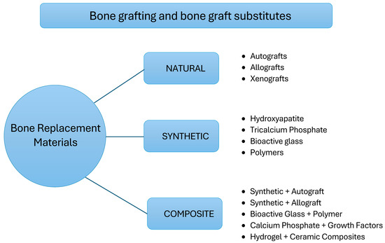 Bone tissue regeneration is a critical aspect of orthopedic and dental surgery. Conditions requiring bone tissue regeneration can be caused by trauma, infections, malignant lesions, or congenital defects or can develop as a consequence of applied treatment, such as following radiotherapy of malignant lesions [1,2]. In dentistry, the occurrence of bone resorption leading to alveolar bone defects surpasses 90% and depends on patient demographics, oral hygiene practices, and general health [3]. Bone grafting and bone graft substitutes are frequently employed to provide structural support, protect from bone loss, secure capacity for future prosthetic implantation, and facilitate bone healing. A variety of bone grafts are available and are classified according to their origin into natural, synthetic, and composite categories. Natural bone graft materials encompass autogenic allogeneic and xenogeneic sources, while synthetic options include hydroxyapatite, tricalcium phosphate, bioactive glass, and polymers. Composite bone graft materials represent a hybrid of natural and synthetic components. Each type of bone graft material presents a distinct set of advantages and disadvantages [4] (see Figure 1). In the USA, the use of bone graft procedures has been on a downward trend over time. During the period from 2000 to 2003, autogenous bone grafts accounted for 83% of the procedures, while artificial bone grafts constituted 17%. Nonetheless, with the aid of contemporary advancements and novel surgical techniques, it is now feasible to extend the eligibility criteria for older patients, reduce the treatment burden, and shorten the duration of procedure-related hospitalization [4].