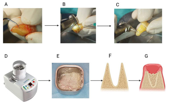 Diagram of the specimen preparation and clinical application process: (A,B) debridement of the third molar root following extraction; (C) removal of the tooth crown before grinding; (D) use of the Smart Dentin Grinder™ apparatus (KometaBio Inc., Cresskill, NJ, USA); (E) graft material post-grinding; (F) image of the alveolar socket before grafting; (G) image of the alveolar socket after grafting.