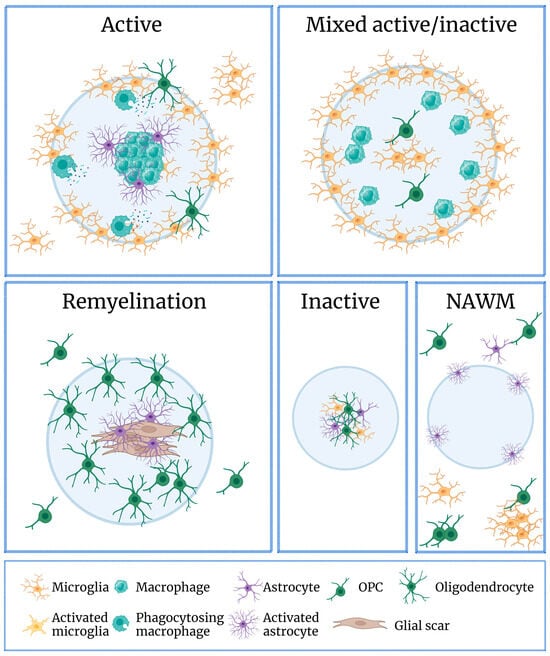 Glial cells populate lesions in a heterogeneous manner during the course of MS lesions. During the course of the disease, lesions change in respect to glial cell population. Active lesions contain macrophages at the center, while astrocytosis starts to be present. The rim of the lesion is populated with microglia which recruit other inflammatory cells to the site, as well as myelin-phagocytosing macrophages. Mixed active/inactive lesions do not show significant astrocyte population, while there is distinct formation of microglia around the rim. Additionally, there is recruitment of OPCs. Remyelination can be seen as a shadow plaque, where oligodendrocytes slowly initiate the repair process. Astrocytes and glial scar formation are clearly present at the center of the lesion. Inactive lesions show some degree of scar with few astrocytes and microglia present. Last but not least, recruitment of OPCs, and microglia nodules, can be seen in the NAWM, even in significant distance from the lesion site. OPC, Oligodendrocyte precursor cells; NAWM, normal-appearing white matter (figure was created with BioRender.com).