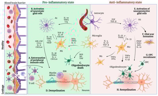 Glial cells in the center of inflammation and neurodegeneration in MS. During early MS, there is a significant compromise of the BBB, through which activated immune cells extravasate from the periphery into the CNS. Both astrocytes and microglia are activated into A1 and M1 states, respectively, and by secreting various pro-inflammatory molecules induce further in myelin destruction. Additionally, peripheral macrophages and microglia assist in myelin debris clearance. The activation of this proinflammatory state is devastating and determines the lesion formation. Later, both astrocytes and microglia shift their activation state into an anti-inflammatory, namely A2 and M2, respectively, whereby inducing scar formation and OPC recruitment, facilitate in myelin repair. Occasionally, there is activation back to the pro-inflammatory states, depending on environmental signals. IL-1α, Interleukin-1alpha; TNFα, Tumor necrosis factor alpha; C1q, Complement 1q; TGF-β, transforming growth factor-beta; IL-1β, Interleukin-1beta; CXCL10, C-X-C motif ligand 1; VEGF, Vascular endothelial growth factor; GM-CSF, Granulocyte-macrophage colony-stimulating factor; CCL2, C-C motif ligand 2; IL-6, Interleukin 6; IL-2, Interleukin 2; MΦ, Macrophage; ROS, Reactive oxygen species; NO, Nitric oxide; TNF, Tumor necrosis factor; IFNγ, Interferon gamma; FGF, Fibroblast growth factor; IL-10, Interleukin 10, IL-4, Interleukin-4; IGF-1, Insulin-like growth factor 1; IL-1β, Interleukin 1 beta; PDGF, Platelet derived growth factor; OPC, Oligodendrocyte precursor cell; IL-33, Interleukin 33 (figure was created with BioRender.com).