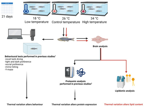 Experimental framework for analysing thermal variation effects in adult zebrafish. Fish were maintained at 18 °C (low temperature), 26 °C (control temperature), or 34 °C (high temperature) for 21 days (chronic exposure). After their treatment, the fish were euthanised, and their brains were surgically dissected for lipidomic analysis (red line and arrows). Previous studies conducted by our research group investigated behavioural and brain proteomic responses in zebrafish exposed to the same thermal conditions (black line and arrows). The results indicate that thermal variation significantly alters behaviour, protein expression, and lipid content in the zebrafish brain. 1 and 2 refer to the bibliographic citations of previous works [19,20,21,22,23].
