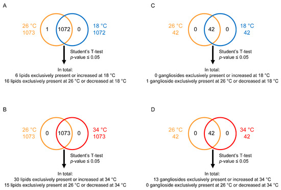 Extraction and analysis of zebrafish brain lipids. Venn diagrams depicting lipids extracted from brains of adult zebrafish subjected for 21 days to three temperature conditions, namely, 18 °C, 26 °C (control), and 34 °C, and analysed via untargeted (A,B) and targeted lipidomics approaches (C,D). A statistical evaluation was applied for each one-to-one comparison. Lipids were considered to be differentially expressed if they were present only in one condition or showed a significant t-test difference (Student’s t-test p-value ≤ 0.05).