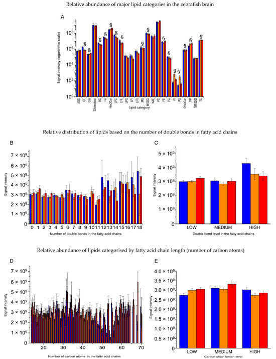 Untargeted brain lipid profile of adult zebrafish maintained at temperatures of 18 °C (blue), 26 °C (orange), and 34 °C (red). (A): relative amount of the main lipid categories represented with a logarithmic scale. Analysis with two-way ANOVA followed by Tukey’s post hoc test only identified significant differences between phosphatidylcholine and other lipid categories (§, p ≤ 0.05); (B): relative quantity of lipids with different numbers of double covalent bonds in the fatty acid chains. (C): relative quantity of lipids characterised by low (0–6), medium (7–12), and high (13–18) numbers of double covalent bonds. Analysis with two-way ANOVA followed by Tukey’s post hoc test did not identify significant differences in the content of double covalent bonds between temperatures. (D): relative quantity of lipids characterised by different sizes evaluated by the number of carbon atoms in the fatty acid chains. (E): relative quantity of lipids characterised by low (0–25), medium (26–50), and high (51–75) numbers of carbon atoms. Analysis with two-way ANOVA followed by Tukey’s post hoc test did not identify significant differences in the content of double covalent bonds between temperatures. The data are expressed as means ± S.E.M. in all panels. ASG (acylhexose glutathione); CE (cholesterol ester); Cer (ceramides); Cholesterol (cholesterol); DG (diacylglycerol); FA (fatty acid); Hex2Cer (dihexosyl-ceramides); LPC (lysophosphatidylcholine); LPE (lysophosphatidylethanolamine); LPG (lysophosphatidylglycerol); LPI (lysophosphatidylinositol); LPS (lysophosphatidylserine); MG (monoglyceride); MGDG (monogalactosyldiacylglycerol); NAE (N-acylethanolamine); PC (phosphatidylcholine); PE (phosphatidylethanolamine); PG (phosphatidylglycerol); PI (phosphatidylinositol); PS (phosphatidylserine); SHexCer (sulfatides/sulfated hexosyl ceramide); SM (sphingomyelin); SMGDG (sulfomonohexosyldiacylglycerol); TG (triacylglycerol).