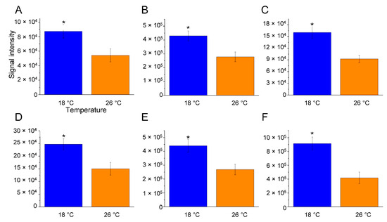 Lipid levels significantly higher at 18 °C compared to 26 °C. Bar graphs show the relative amounts of specific brain lipids at 18 °C (blue) and 26 °C (orange), focusing on those significantly elevated in the 18 °C vs. 26 °C comparison. Lipid species are as follows: (A): PE 36:3;O|PE 16:0_20:3;O (C41H76NO9P); (B): PE 38:3;O|PE 18:0_20:3;O (C43H80NO9P); (C): PE 40:4;O|PE 18:1_22:3;O (C45H82NO9P); (D): PE 42:9;O|PE 22:6_20:3;O (C47H76NO9P); (E): PE 44:9;O|PE 22:6_22:3;O (C49H80NO9P); (F): SM 40:7;O3 (C45H79N2O7P). The data are expressed as means ± S.E.M. and were analysed using one-way ANOVA with Tukey’s post hoc correction. * p ≤ 0.05 in 18 °C versus 26 °C comparison. p-values are reported in Table 1. N = 4.