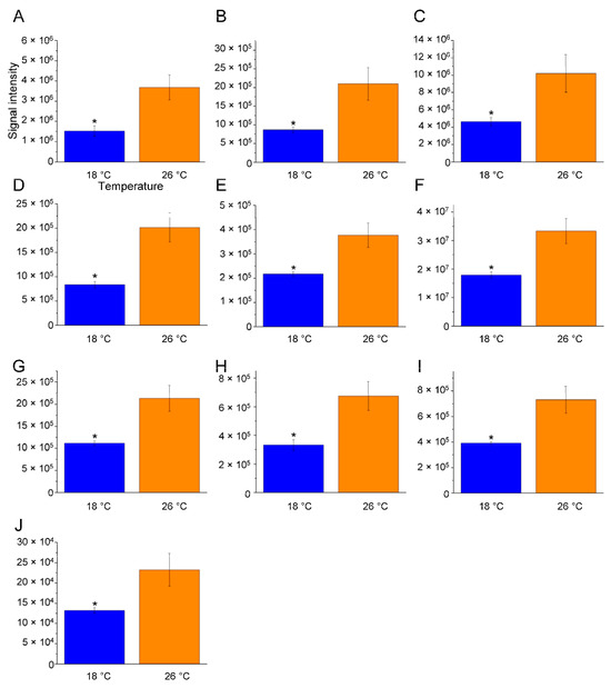 Lipid levels significantly reduced at 18 °C compared to 26 °C. Bar graphs display the relative amounts of brain lipids at 18 °C (blue) and 26 °C (orange), focusing on those significantly decreased in the 18 °C vs. 26 °C comparison. Lipid species are as follows: (A): SM 37:3;O2 | SM 19:3;O2/18:0 (C42H81N2O6P); (B): SM 38:1;O2 | SM 21:0;O2/17:1 (C43H87N2O6P); (C): SM 40:1;O2 | SM 18:1;O2/22:0 (C45H91N2O6P); (D): SM 40:2;O2 | SM 18:1;O2/22:1 (C45H89N2O6P); (E): SM 42:1;O3 (C47H95N2O7P); (F): SM 42:2;O2 | SM 18:1;O2/24:1 (C47H93N2O6P); (G): SM 42:3;O2 | SM 18:1;O2/24:2 (C47H91N2O6P); (H): SM 42:4;O2 | SM 18:1;O2/24:3 (C47H89N2O6P); (I): SM 44:3;O2 | SM 18:1;O2/26:2 (C49H95N2O6P); (J): SM 44:4;O2 | SM 18:1;O2/26:3 (C49H93N2O6P). The data are expressed as means ± S.E.M. and were analysed via one-way ANOVA with Tukey’s post hoc correction. * p ≤ 0.05 in 18 °C versus 26 °C comparison. p-values are reported in Table 1. N = 4.