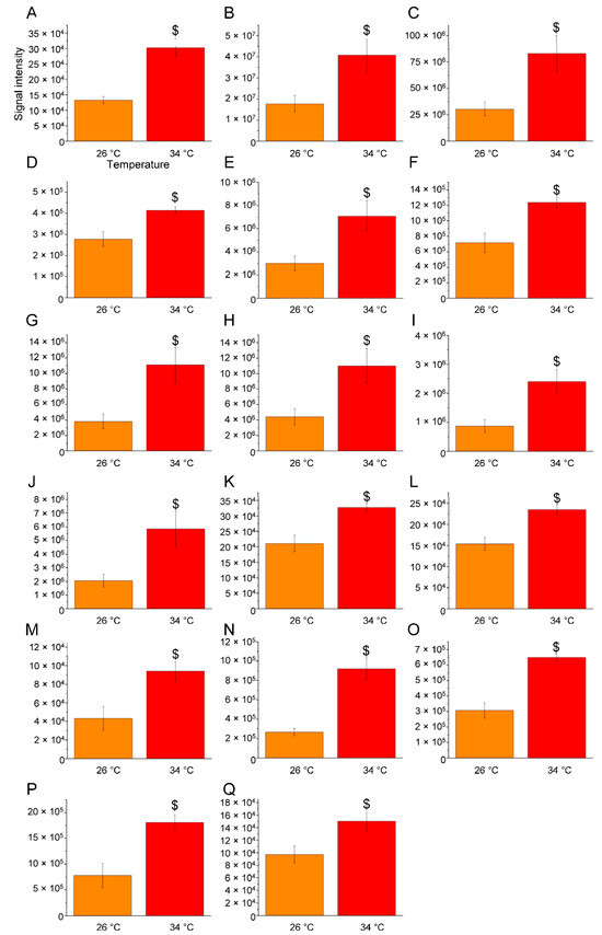 Lipids whose levels were significantly increased at 34 compared to 26 °C. Bar graphs display the relative amounts of brain lipids at 26 °C (orange) and 34 °C (red), focusing on those significantly elevated in the 34 °C vs. 26 °C comparison. Lipid species are as follows: (A): PE 34:0;O|PE 16:0_18:0;O (C39H78NO9P); (B): PE 34:1|PE 16:0_18:1 (C39H76NO8P); (C): PE 36:1|PE 18:0_18:1 (C41H80NO8P); (D): PE 38:3;O|PE 18:0_20:3;O (C43H80NO9P); (E): PE 40:1|PE 22:0_18:1 (C45H88NO8P); (F): PE 40:3;O|PE 18:0_22:3;O (C45H84NO9P); (G): PE 42:1|PE 24:0_18:1 (C47H92NO8P); (H): PE 42:2|PE 18:1_24:1 (C47H90NO8P); (I): PE 42:7|PE 18:1_24:6 (C47H80NO8P); (J): PE 44:1|PE 26:0_18:1 (C49H96NO8P); (K): LPE-N (FA)36:0|LPE-N (FA 18:0)18:0 (C41H82NO8P); (L): Cer 50:11;O4|Cer 28:4;O3 (FA 22:6) (C50H79NO5); (M): SM 33:0;O2 (C38H79N2O6P); (N): SM 34:1;O3 (C39H79N2O7P); (O): SM 38:6;O2|SM 17:2;O2/21:4 (C43H77N2O6P); (P): SM 44:0;O2|SM 18:0;O2/26:0 (C49H101N2O6P); (Q): SM 46:6;O3 (C51H93N2O7P). The data are expressed as means ± S.E.M. and were analysed via one-way ANOVA with Tukey’s post hoc correction. $ p ≤ 0.05 in 34 °C versus 26 °C comparison. p-values are reported in Table 2. N = 4.