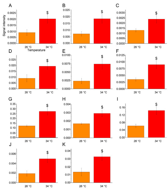 Gangliosides whose levels were significantly increased at 34 °C compared to 26 °C. Bar graphs display the relative amounts of brain gangliosides at 26 °C (orange) and 34 °C (red), focusing on those significantly elevated in the 34 °C vs. 26 °C comparison. Gangliosides species are as follows: (A): GD0a/b(36:0)-2H (C92H161N5O44); (B): GD1a/b (d18:1/18:0) (C85H149N3O39); (C): GD1a/b(36:1) (OH) (C84H148N4O40); (D): GD1a/b(38:1) (NeuGc)-2H/O-Ac-GD1b(36:0)-2H (C86H150N4O40); (E): GM2 d18:1-18:0 (C67H121N3O26); (F): GM3 d18:1-18:0 (C59H108N2O21); (G): GQ1a/b(36:0) (C106H182N6O55); (H): GQ1a/b(36:2) (C106H178N6O55); (I): GT3(36:0) (C81H142N4O37); (J): GT3(42:2) (C87H150N4O37); (K): O-Ac-GD1a/b(38:0)-2H/GD1a/b(40:2) (OH)-2H (C88H154N4O40). The data are expressed as means ± S.E.M. and were analysed via one-way ANOVA with Tukey’s post hoc correction. $ p ≤ 0.05 in 34 °C versus 26 °C comparison. p-values are reported in Table 2. N = 4.