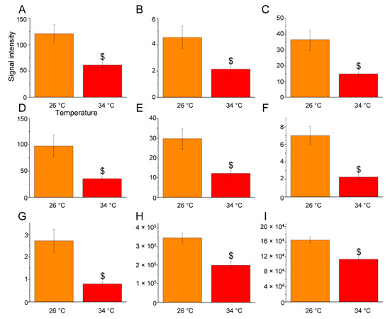 Lipids whose levels were significantly reduced at 34 °C compared to 26 °C. Bar graphs display the relative amounts of brain lipids at 26 °C (orange) and 34 °C (red), focusing on those significantly decreased in the 34 °C vs. 26 °C comparison. Lipid species include: (A): LPE O-18:2 (C23H46NO6P); (B): LPE O-18:3 (C23H44NO6P); (C): LPE O-19:1 (C24H50NO6P); (D): LPE O-20:1 (C25H52NO6P); (E): LPE O-20:2 (C25H50NO6P); (F): PE O-42:1|PE O-18:1_24:0 (C47H94NO7P); (G): PE O-44:1|PE O-18:1_26:0 (C49H98NO7P); (H): PG O-38:3|PG O-20:2_18:1 (C44H83O9P); (I): MGDG 34:1|MGDG 16:0_18:1 (C43H80O10). The data are expressed as means ± S.E.M. and were analysed via one-way ANOVA with Tukey’s post hoc correction. $ p ≤ 0.05 in $ 34 °C versus 26 °C comparison. p-values are reported in Table 2. N = 4.