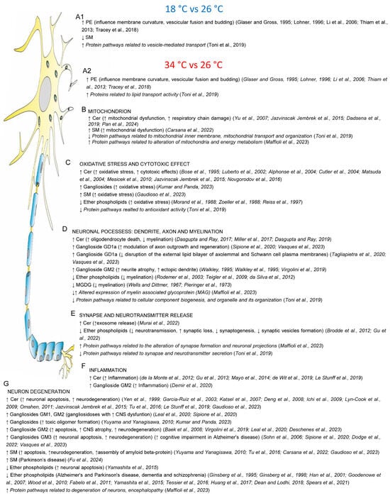 Schematic representation of the main alterations in the lipid component of the zebrafish brain caused by exposure to low (18 °C vs. 26 °C, above) and high (34 °C vs. 26 °C, below) temperatures and their possible effects. Literature suggests that the observed lipid alterations may impact several cellular and neurological processes, including membrane curvature, vesicular fusion, and budding (A1,A2), mitochondrial function (B), oxidative stress and cytotoxicity (C), neuronal structures such as dendrites, axons, and myelination (D), synaptic activity and neurotransmitter release (E), inflammation (F), and neurodegeneration (G). Downregulation (↓) and upregulation (↑) are indicated. Possible effects, deduced from information from the literature, are indicated in parentheses. Proteome alterations identified in previous work are reported in italics. Previous work are reported in italics: [19,45,46,47,48,49] (A1,A2), [19,21,51,52,53,54,55] (B), [19,51,56,57,58,59,60,61,62,63,64,65,66,67] (C), [19,21,68,69,70,71,72,73,74,75,76,77,78,79,80,81] (D), [19,21,82,83,84] (E), [85,86,87,88,89,90] (F), [21,51,55,63,64,71,72,76,88,91,92,93,94,95,96,97,98,99,100,101,102,103,104,105,106,107,108,109,110,111,112,113,114,115,116] (G).