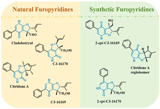 Furan rings have shown remarkable efficacy in selectively targeting tumor cells [,,]. Some furan derivatives have exhibited a remarkable range of biological activities and played a crucial role in the molecular structure of pharmaceutical chemistry for anti-bacterial and anti-fungal applications, including furazolidone, furantanone, furantoin, and furacillin [,,]. Meanwhile, the heterocyclic skeleton is an important structure for many natural products with excellent biological activity, and it is widely used in the design and discovery of new molecules with potential pharmacological activity. Pyridine-ring drugs are an extensive category of heterocyclic compounds, encompassing both natural drugs and synthetic drugs, like nicotine, piroxicam, quinine, camptothecin, diazepam, 4-vinylpyridine, aripiprazole, and lidocaine [,]. The addition of heterocyclic structures into drug molecules is an important way to design and synthesize biologically active compounds in anti-tumor drugs; as shown in Figure 1, some compounds of synthetic natural furopyridines and synthetic furopyridines have been published so far []. As a result, there has been a keen focus on the synthesis and isolation of furan-containing heterocyclic compounds, driven by their profound significance in both pharmaceutical and agricultural applications [].