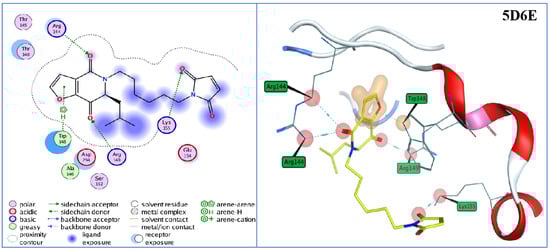 As shown in Figure 2 and Figure 3, the molecular docking of the highly active compound 4c with two receptor proteins is depicted in 2D and 3D diagrams. Compound 4c docked with the receptor protein 5D6E, as shown in Figure 2. The furan ring of the parent compound was involved in a π-stacking interaction with amino acid residue Trp148. The carbonyl group of the pyridinone on the parent compound formed hydrogen bonds with amino acid residues Arg149 and Arg144, respectively. Additionally, a carbonyl group in the substituent formed a hydrogen bond with amino acid residue Lys155. These results suggest that the protein METAP2 could be a potential target for furan–pyridinone derivatives, with the C=O part of the pyridone moiety likely playing a crucial role in binding.