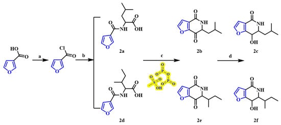Synthesis of furan [3,2-c] pyridine compound. Reagents and conditions: a—SOCl2, reflux, 75 °C; b—(2a) L-leucine, DCM, rt, 27.5%; (2d) L-isoleucine, DCM, rt, 32.4%; c—Eaton’s reagent (P2O5/MeSO3H), 110 °C, 28.9–40.3%; d—NaBH4, 0 °C, 63.5–71.5%.