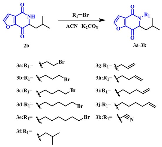 The compound 3-furoyl-L-leucine was synthesized by the Schotten–Baumann acylation reaction with L-leucine and 3-furoyl chloride. Then, the leading compound 6-isobutyl-5,6-dihydrofuro [3,2-c] pyridine-4,7-dione was synthesized by Friedel–Crafts acylation as an intramolecular cyclization reaction of 3-furoyl-L-leucine catalyzed by Eaton’s reagent. The furan [3,2-c] pyridine derivatives were reduced by NaBH4 from the parent compound. The furan [3,2-c] pyridine derivatives 3a–3k were synthesized by reflux with acetonitrile based on parent compound 2b and the potassium carbonate as a catalyst. The general reaction formula is shown in Scheme 2.