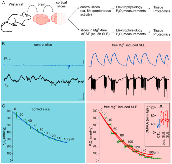 Epilepsy-related changes in cerebral metabolic rate of oxygen (CMRO2). (A) Graphical representation of the experimental protocol. Cortical slices from one Wistar rat were randomly separated into two groups (control slices maintained for at least 8 h in normal aCSF and slices maintained for the same amount of time in Mg2+-free aCSF). (B) Slices maintained in normal aCSF displayed spontaneous activity (left, blue background, field potential (f.p.) trace on the bottom in black and extracellular potassium ([K+]o) on top in blue) and slices treated with Mg2+-free aCSF displayed seizure-like events (SLEs, right, red background, field potential trace on the bottom in black and extracellular potassium on top in blue). Scales represent 1 mM in the [K+]o trace, 1 mV in the field potential trace, and 10 s, respectively. (C) Measurement of tissue O2 at different depths (in µm) in control and treated slices. The ptiO2 profiles show increased oxygen demand in slices with SLEs (right, red background) compared to control slices (left, blue background). In slices with SLEs, pO2 measurements display seizure-dependent increases in oxygen consumption, thus basal and SLE-associated CMRO2 were calculated (upper and lower red fit line, respectively). Inlet in (C): statistical comparison between the control slices and slices with SLE (colors correspond to the fit lines: blue = control, red = SLE). CMRO2 was significantly increased in epileptic tissue. * p-value < 0.05.