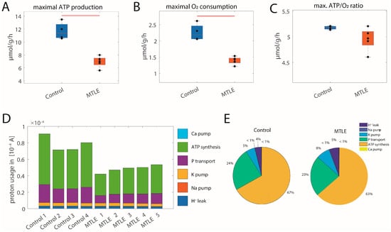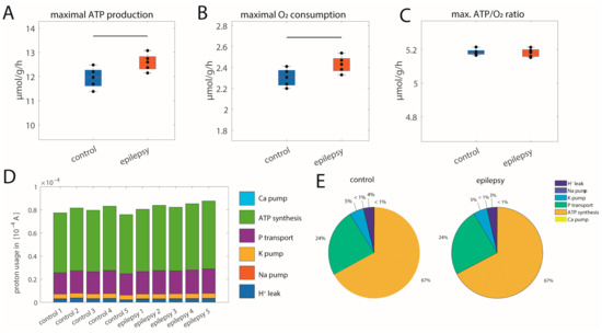 Energy production capacity for control and epilepsy group. (A) Maximal ATP production capacity; (B) corresponding maximal O2 consumption rate; (C) corresponding ATP/O2 ratio; black dots show values for individual samples. The control group is depicted in blue; the epilepsy group is in orange. The center lines represent the median, the boxes represent the interquartile range, and the whiskers are defined by values within 1.5 times the interquartile range. Black bars indicate significant differences between groups with a p-value < 0.05 as assessed with a two-sided t-test. (D) Proton utilization for the different mitochondrial membrane processes given as currents. The size of the different colored bars indicates the magnitude of the different processes (light blue: calcium pumping; green: FOF1-ATPase; purple: phosphate transport; yellow: potassium pumping; red: sodium pumping; dark blue: proton leakage). (E) The mean relative share of the different processes on total proton flux for the two groups.